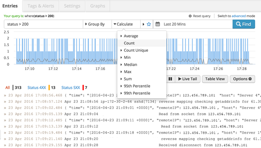 Looking for 404 errors? Simply type “404” into the search bar. Looking for more? Use the Logentries query builder to calculate values including COUNT, SUM, AVERAGE, GROUPBY, MIN, MAX, PERCENTILE and more.