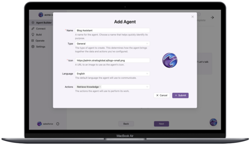 You can run your Stratis AI agents in Agentforce with a single click, speeding up your time to market inside the Salesforce ecosystem, embed them in your own web experiences, or roll them out as mobile agents with no code at all. For mobile, users accept your invite and the agent icon appears on their phone to open like any app. The setup wizard still gives you copy paste Javascript for web, making it easy to bring the same conversational experience to every surface your users rely on.